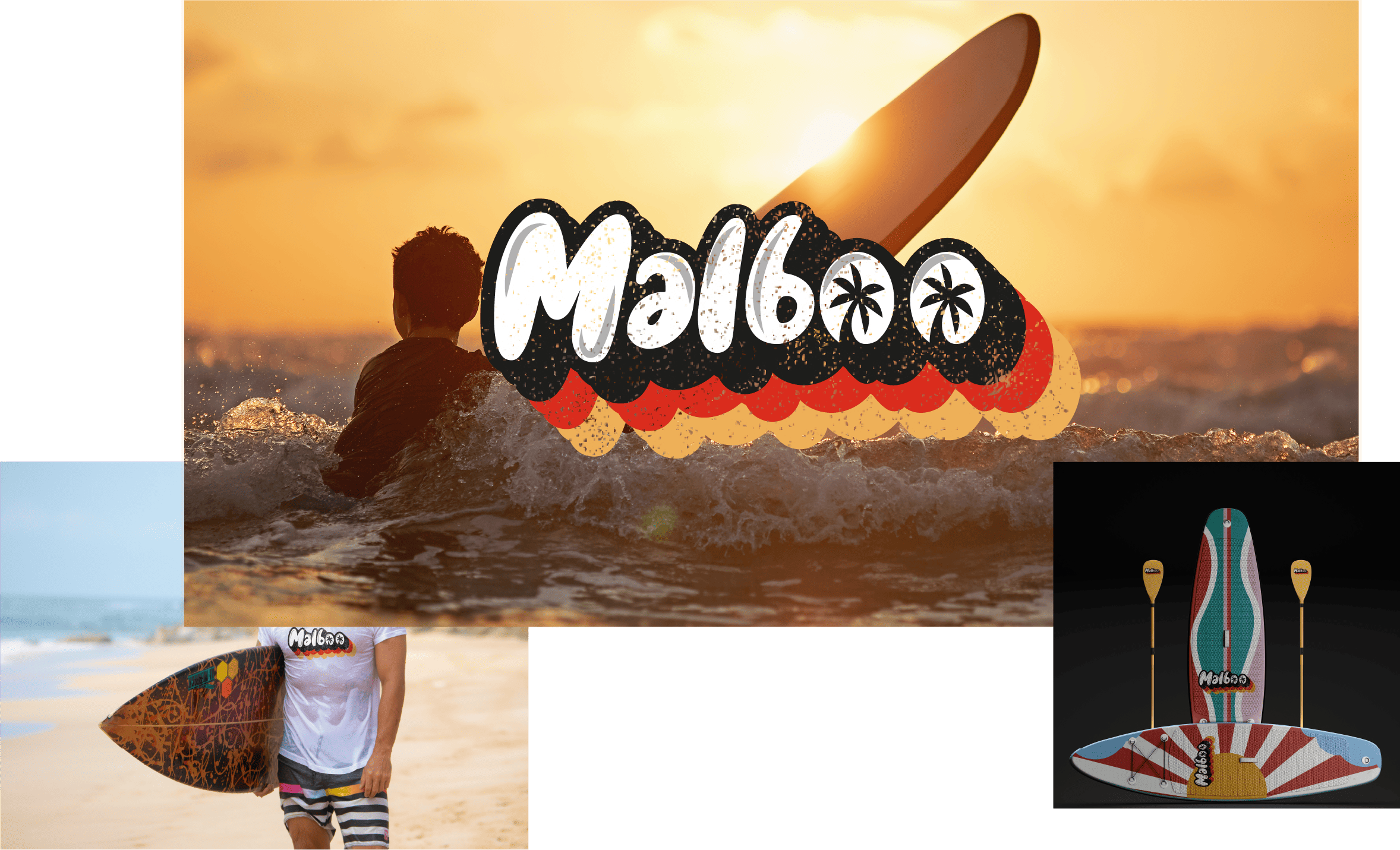 The logo reflects the vibrant tropical spirit of surfing. The design of “Malboo” features bold, playful typography with clear tropical touches, such as palm trees integrated into the letters. The warm colors and wavy lines embody the waves and sunsets, capturing the essence of adventure and passion for the ocean. A perfect design for surf and nature enthusiasts.