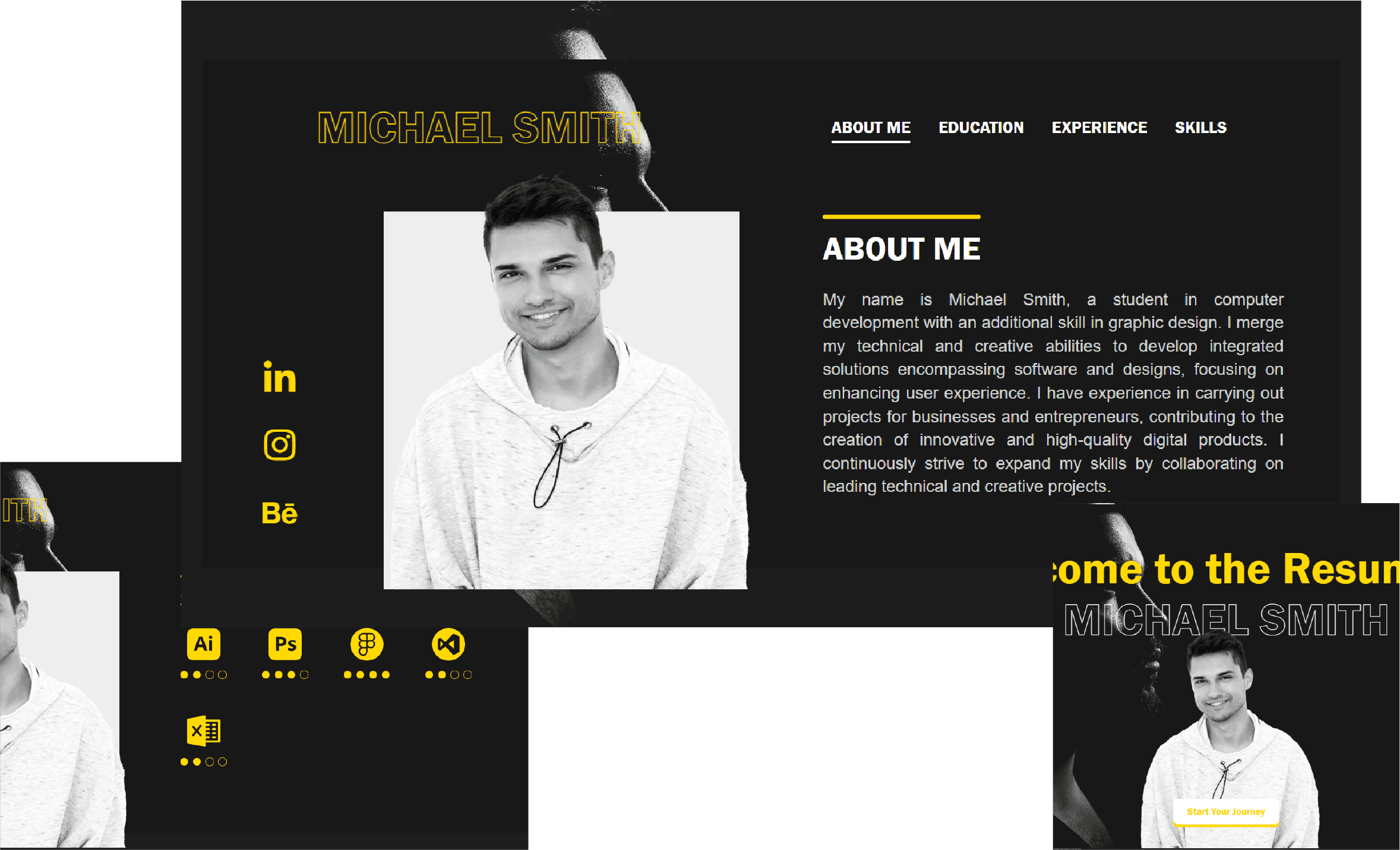 This website serves as an innovative digital CV with a modern design that blends simplicity and professionalism. It features interactive buttons, seamless navigation, and dynamic animations for an engaging user experience. The site effectively showcases skills and experiences in an organized, user-friendly format, reflecting a strong, unique identity.