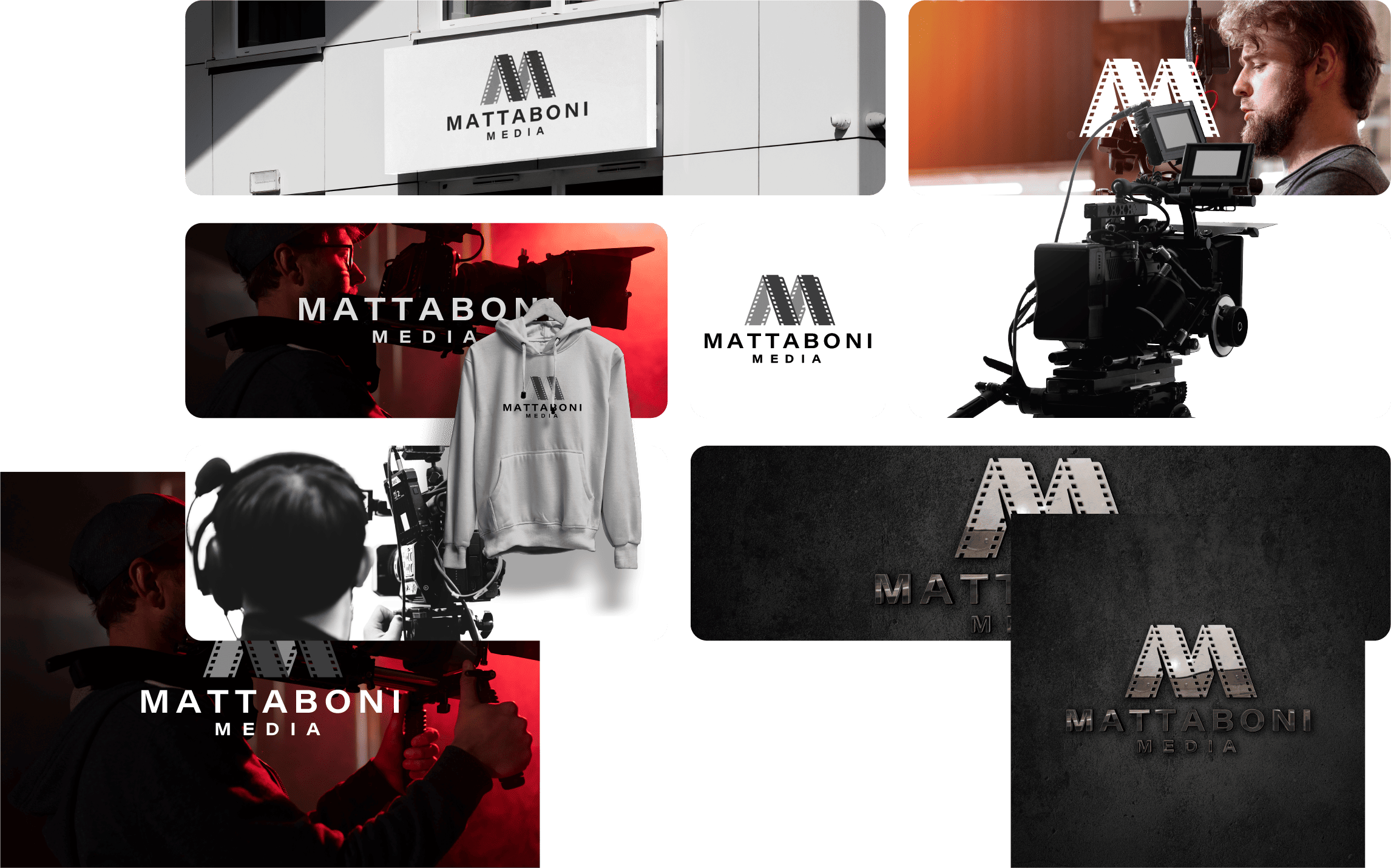 The logo for Mattaboni Media features a unique design that reflects professionalism in videography. A film strip cleverly forms the letter “M,” adding a creative and distinctive touch. The black and dark gray color palette symbolizes strength, elegance, and professionalism, while the clear and readable text ensures the logo is memorable and impactful, perfectly combining originality with modernity.